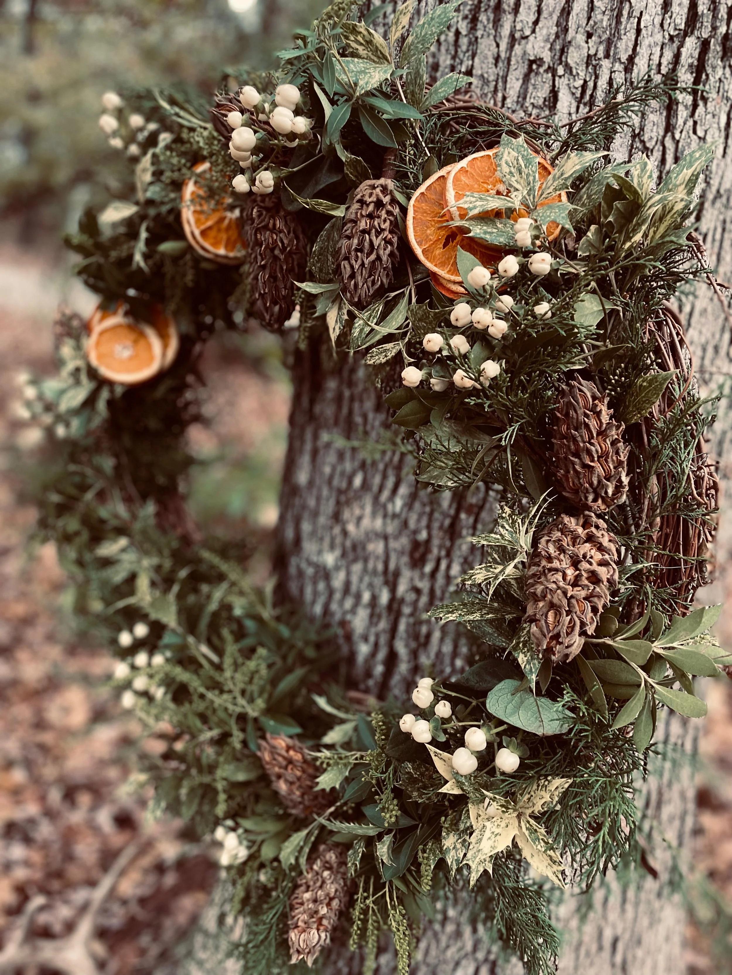 Bring the natural beauty of the forest to your home with our handcrafted woodland wreaths. Made from fresh-cut evergreens, Magnolia pods and leaves, pinecones, berries, and other seasonal treasures, each wreath is a one-of-a-kind piece of art that embodies rustic charm and the essence of nature. Perfect for decorating your front door, mantel, or as a centerpiece.